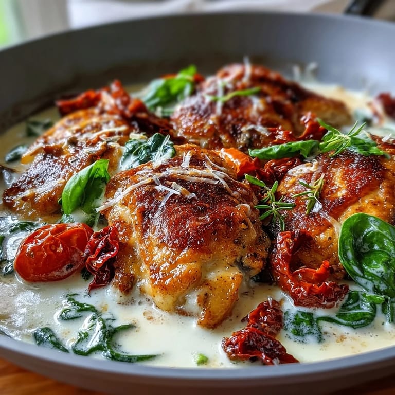 Pin it The beauty of this Creamy Tuscan Chicken lies in its simplicity and depth of flavor. Each chicken breast is seasoned with Italian herbs and seared to golden perfection, locking in juices and creating a flavorful foundation. The sauce comes together in the same skillet, capturing all those delicious browned bits while the garlic and sun-dried tomatoes release their aromatic oils. As the heavy cream and Parmesan meld together, they create a velvety coating that clings to every piece of chicken. The fresh spinach wilts into the sauce, adding color, nutrients, and a subtle earthiness that balances the richness beautifully.