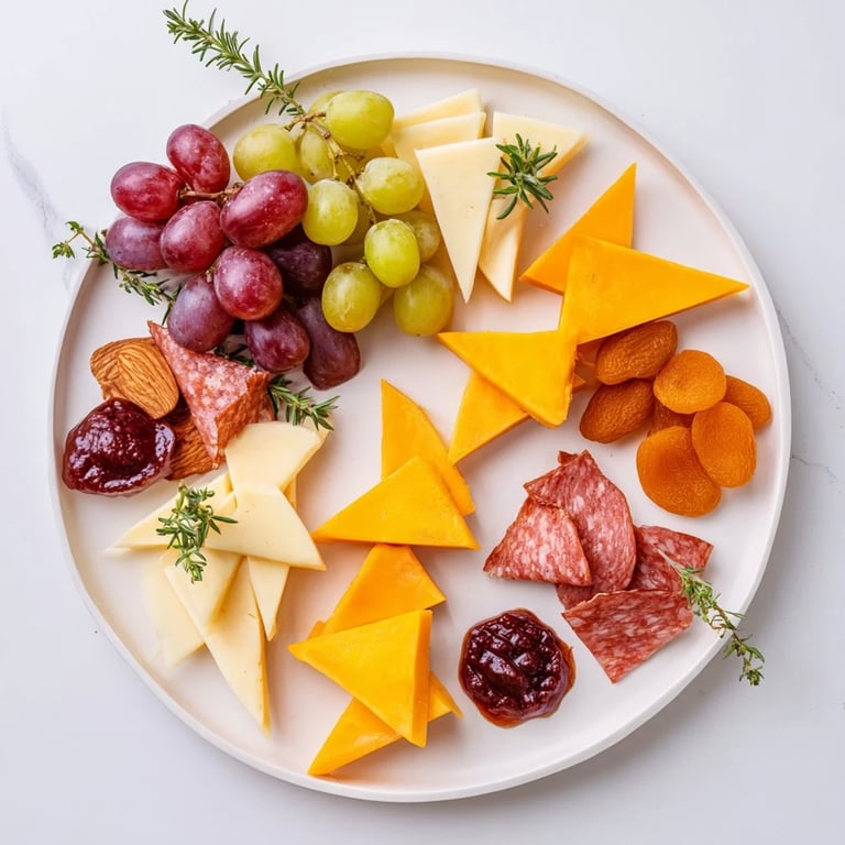 - Place grapes in small clusters to frame sections of cheese and meat, scatter the almonds into gaps, and position the fig jam in a small bowl or spread small dollops directly on the board. Finish with sprigs of rosemary or thyme tucked between items for aroma and movement.