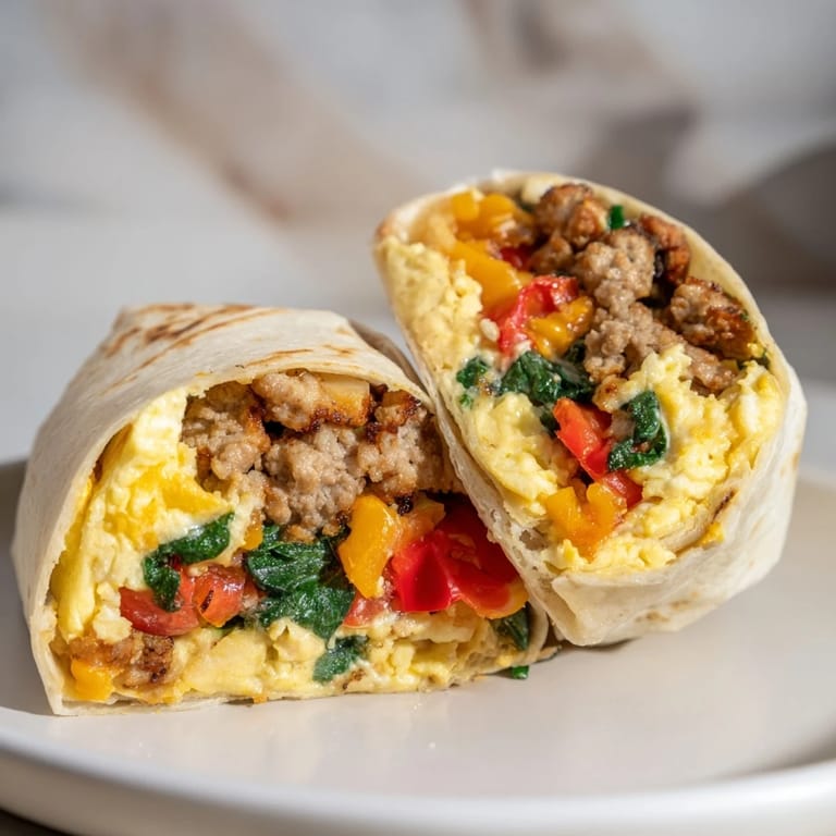 Save Hearty and flavorful breakfast burritos filled with eggs, sausage, vegetables, and cheese, perfect for meal prep and busy mornings.
